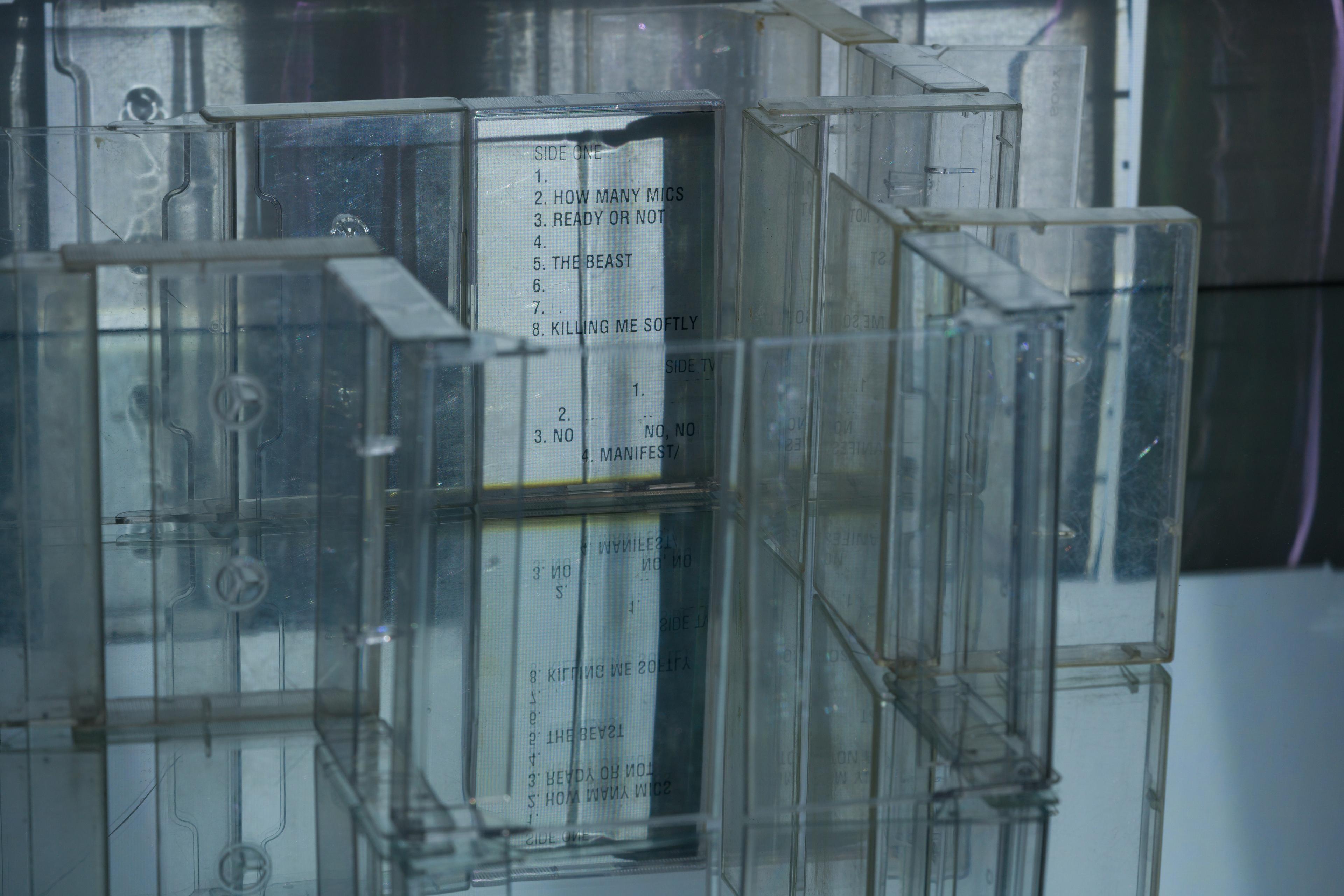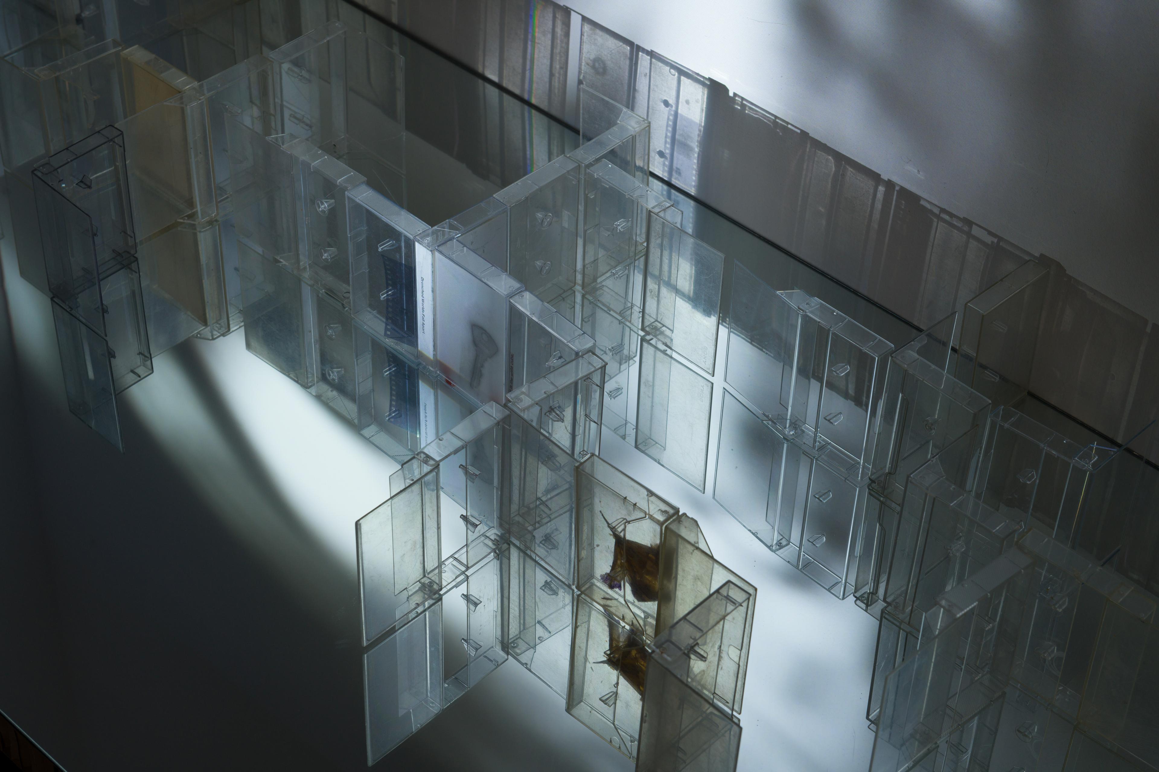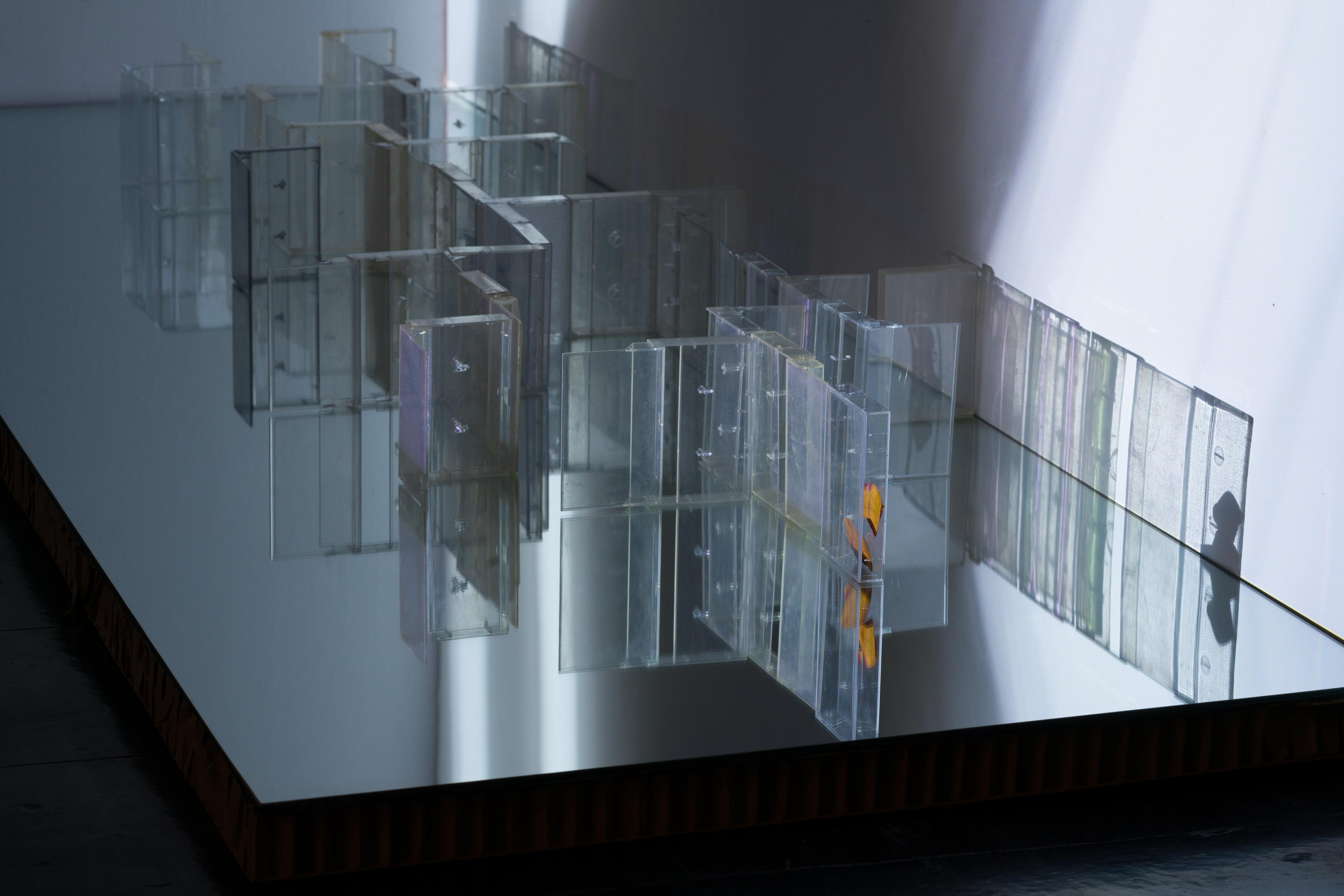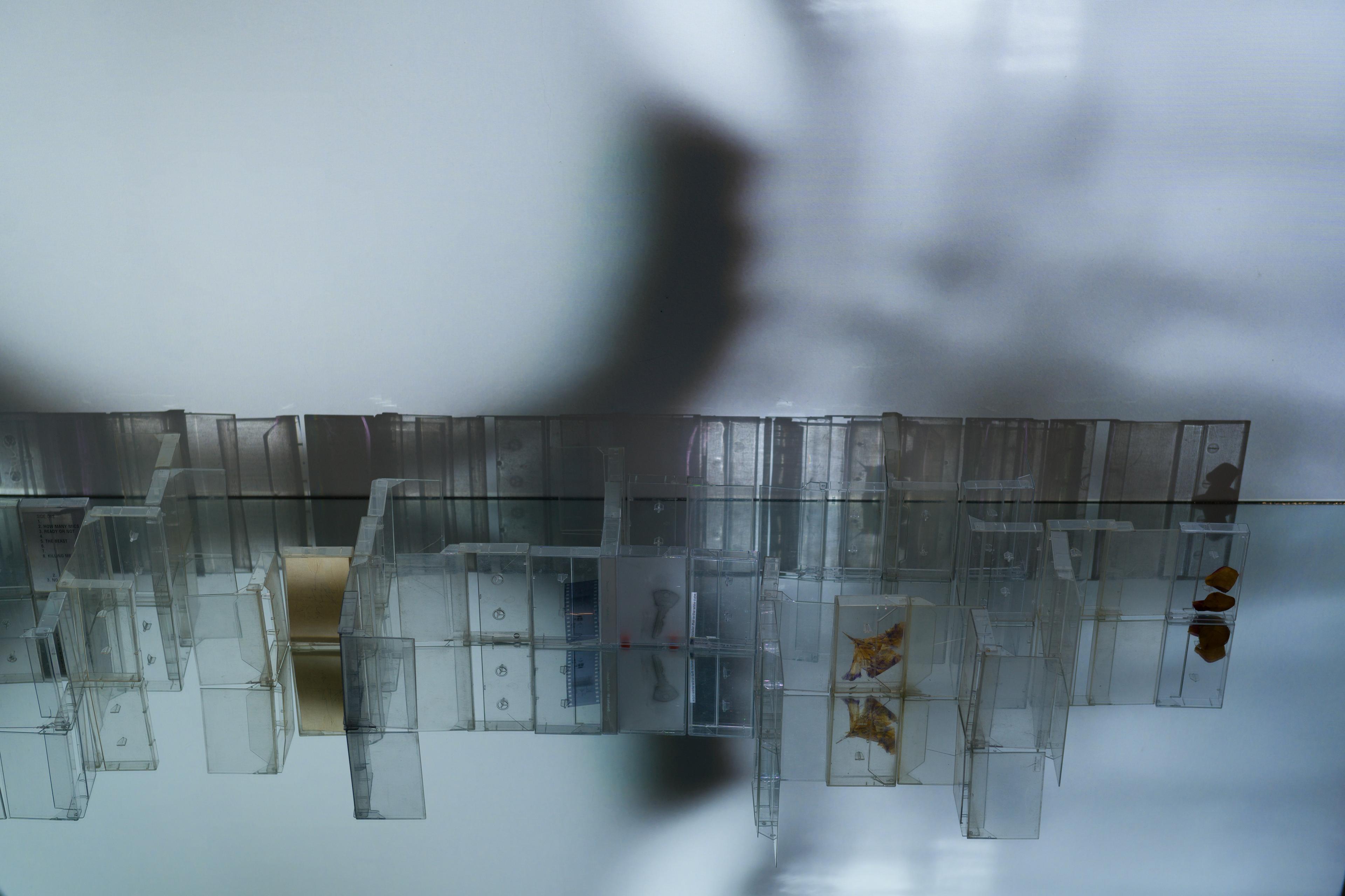Keta Gavasheli, In the middle of the blank page, 2024, Digital video, honeycomb cardboard, mirror, cassette cases, drawing, film negative, leaves, anxiety pills, cutout