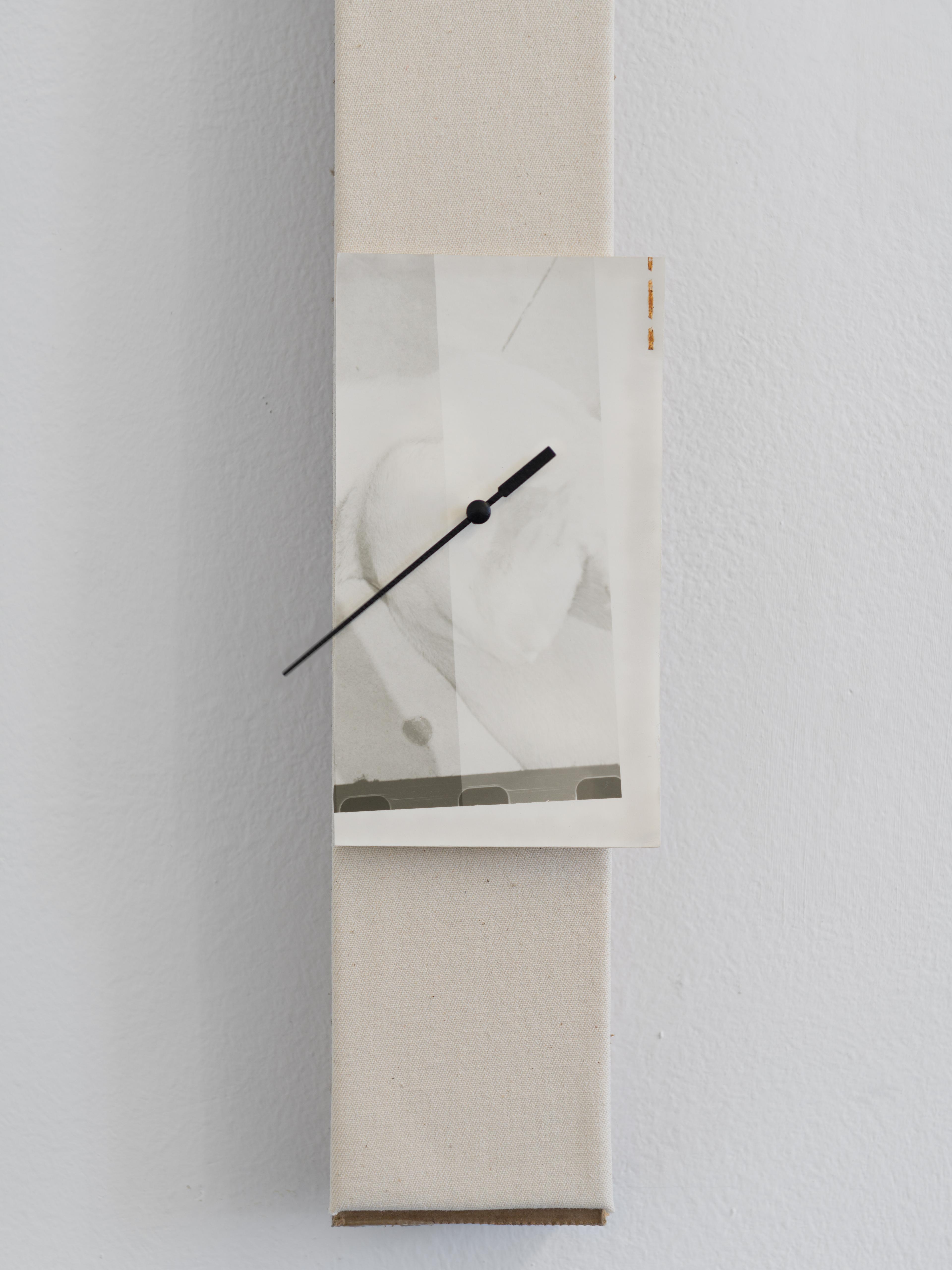 Keta Gavasheli, Someone, sometwo, sometime, summertime, 2024, Silver print, clock arrow, cardboard, 90 × 7 × 4.5 cm