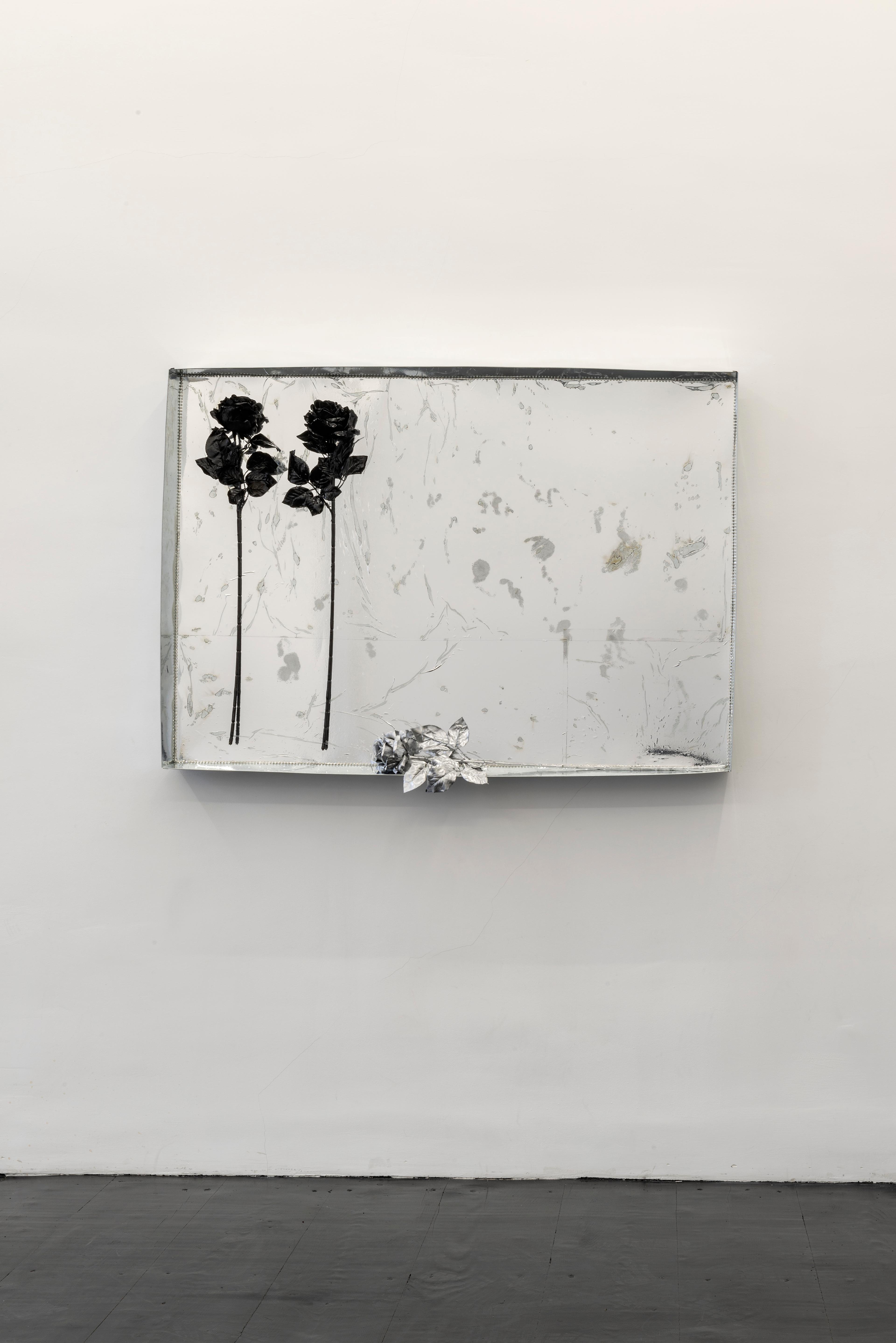 Sitara Abuzar Ghaznawi, Untitled (mirror), 2019, Tin, steel, mirror foil, rhinestone chain, artificial flowers, paint, 120 × 85 × 10 cm
