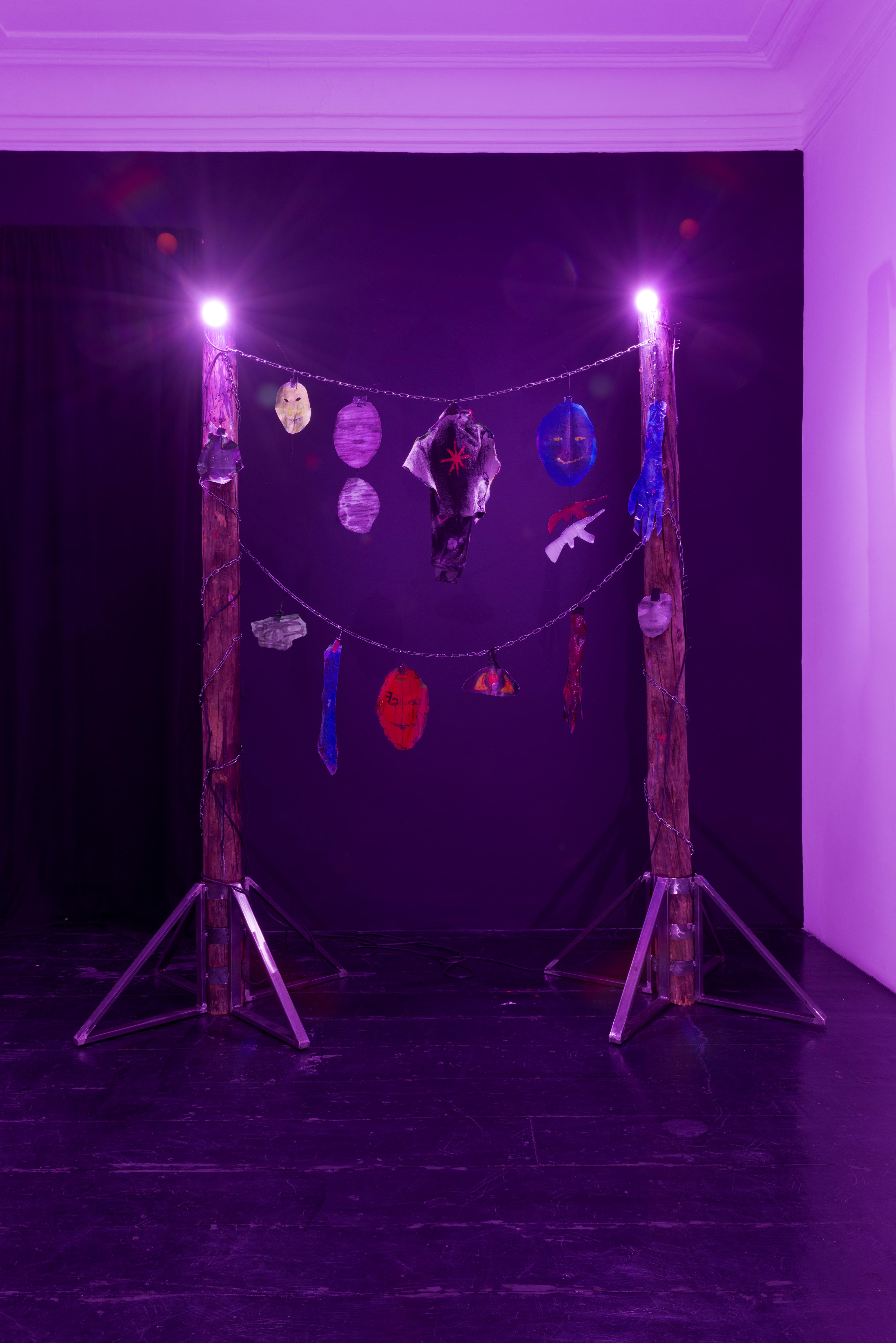 Won Cha, Gate of souls, 2021, Wood, metal, chain, plastic, paper, paint, lightbulbs, 264 × 235 × 80 cm