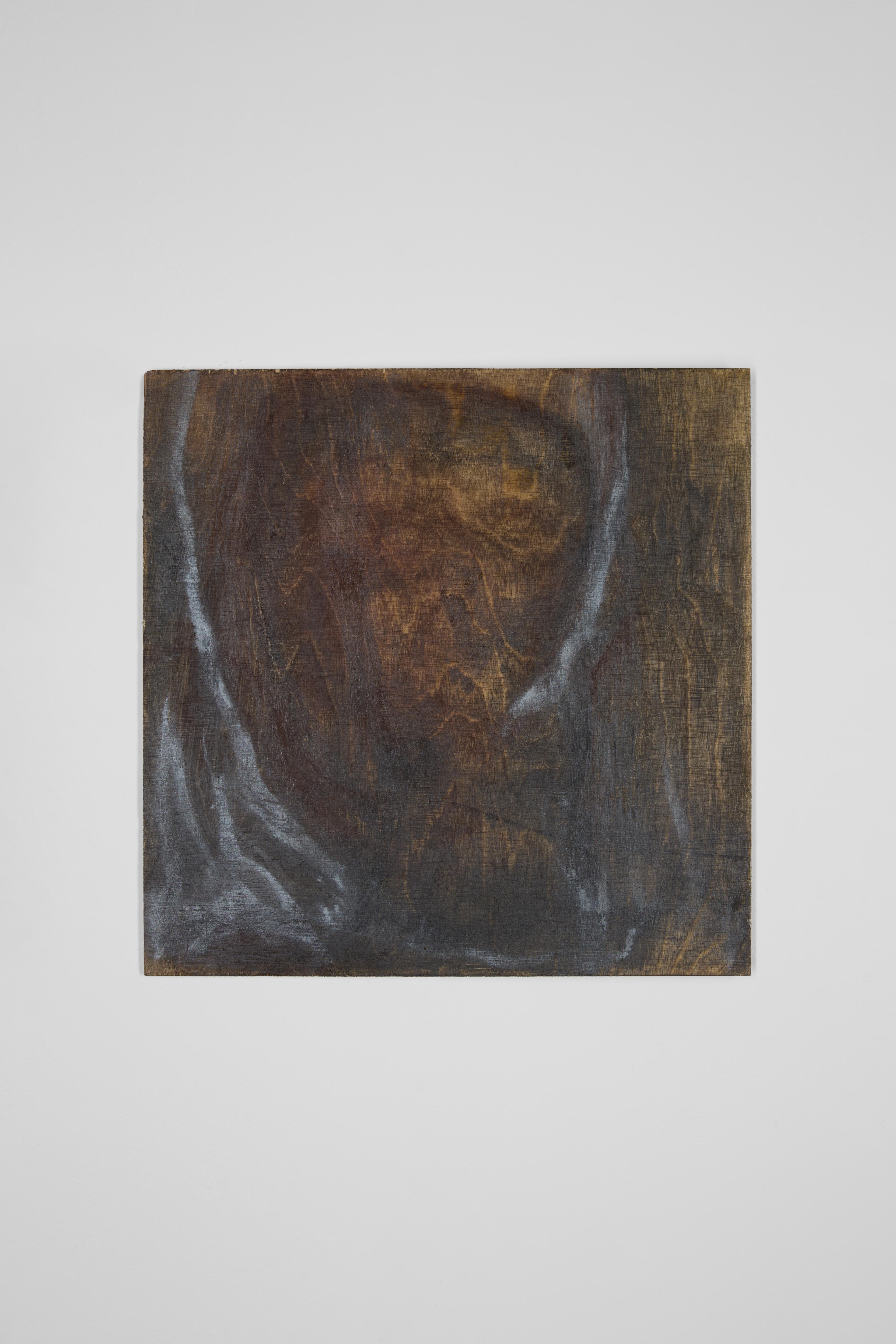 Elene Latchkepiani,Untitled, 2025, oil pastel, burned plexiglass on plywood, 25.3 × 25.4 cm