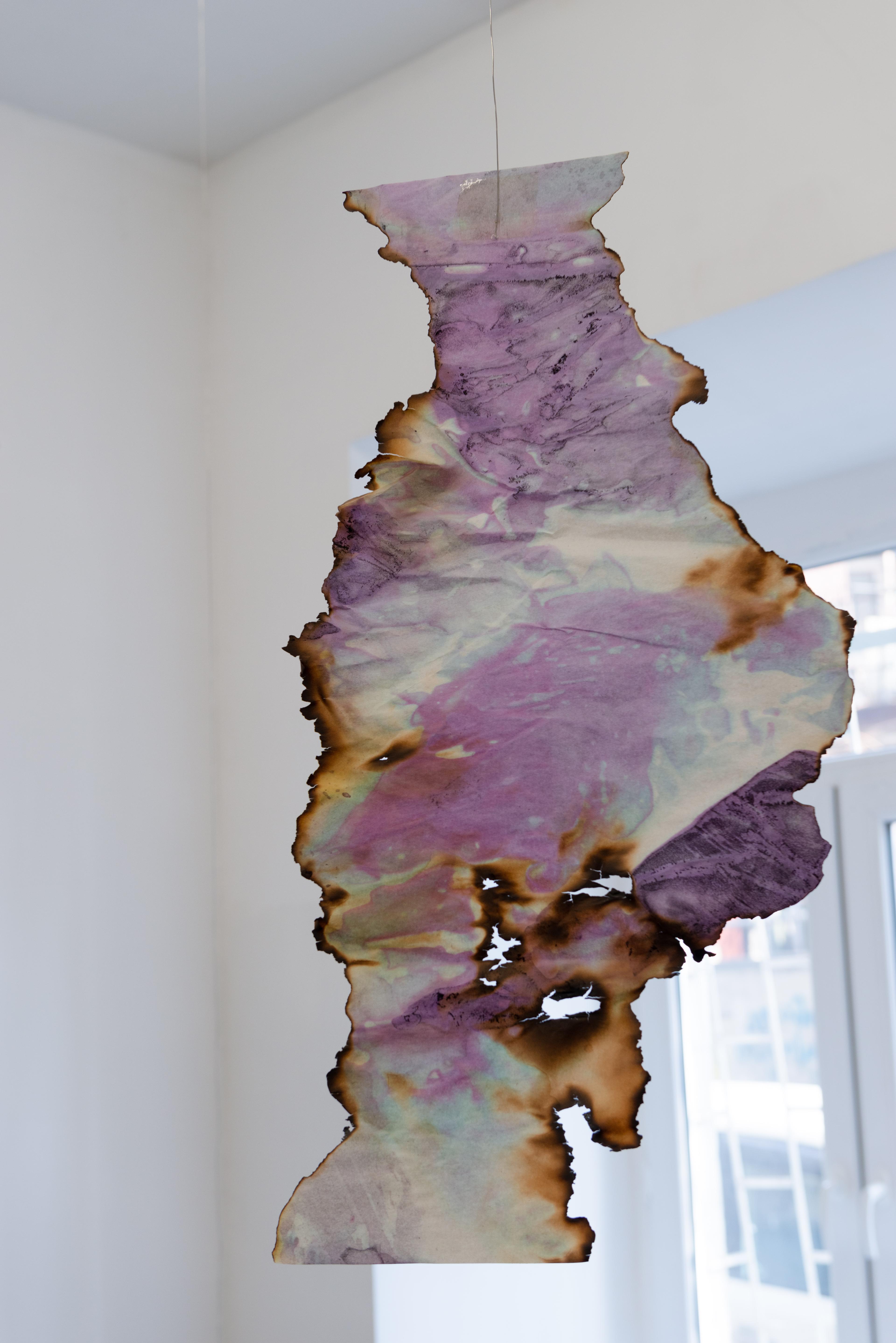 სერ სერპას, Waterworks 9, 2021, შედუღებული მავთული, წებოვანი ლენტა, ღვინო, პარფიუმერია; secretions magnifiques by etat libre d'orange და მელნით გაჟღენთილი დამხვარი ქაღალდი, დაკიდული ან ჩარჩოში, 72 x 40 სმ