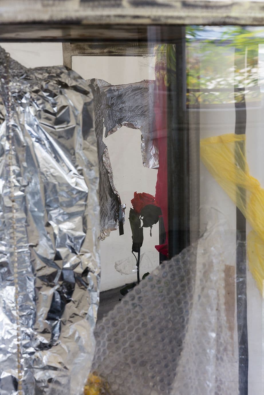 სიტარა აბუზარ ღაზნავი, მარჯვნიდან მარცხნივ-Saint, Chicago, Psalm, 2021 (დეტალი), მეტალი, ორგანული მინა, ქსოვილი, ნაპოვნი მასალა, 132 × 35 × 35 სმ