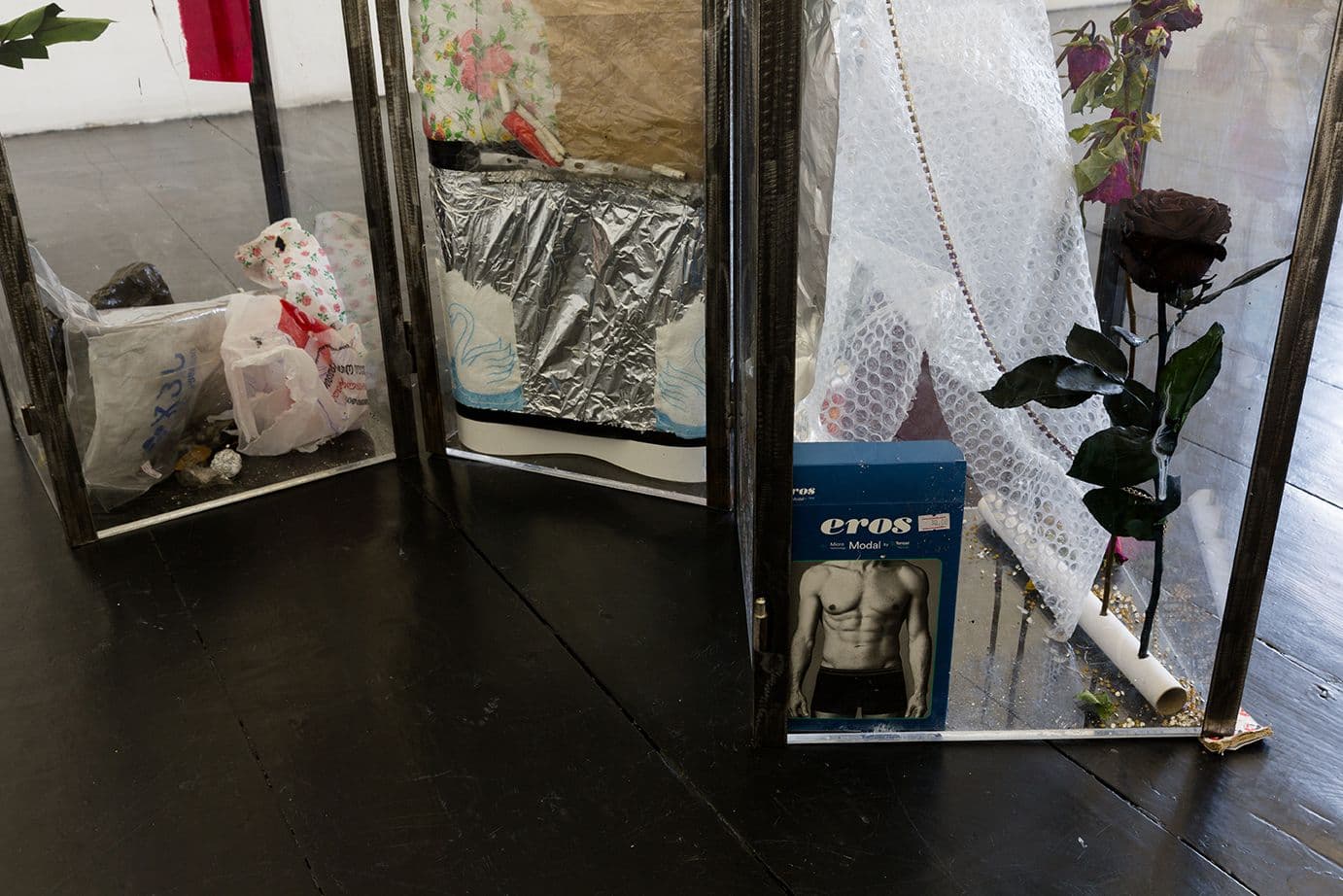 სიტარა აბუზარ ღაზნავი, Mourning Inauguration, 2021 (დეტალი), მეტალი, ორგანული მინდა, ფერწერა ფსოვილზე, ხელოვნური ყვავილები, 3 მოძრავი პანელი 250 x 80 x 20 სმ-ის, ცვალებადი ზომები